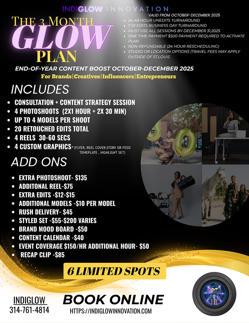 The 3-Month Glow Plan is a business development and content-creation experience designed to help entrepreneurs, creatives, and brands elevate their image, tell their story, and stay consistent leading into the end of 2025.